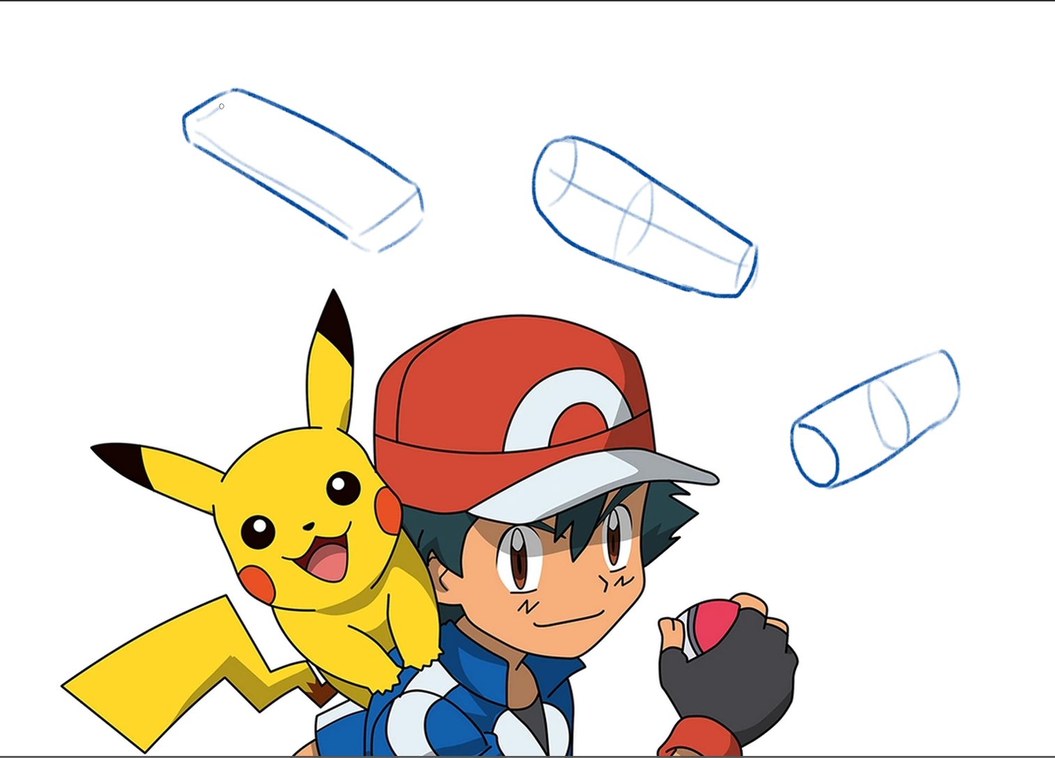 We can see that Ash’s shapes are more simplified. There are less lines and more big, easy-to-see shape like his hair, his hat, even his cloths. There aren’t a lot of folds or anything like that, even the limbs and anatomy are largely basic, building off of forms like cylinders and rectangles.