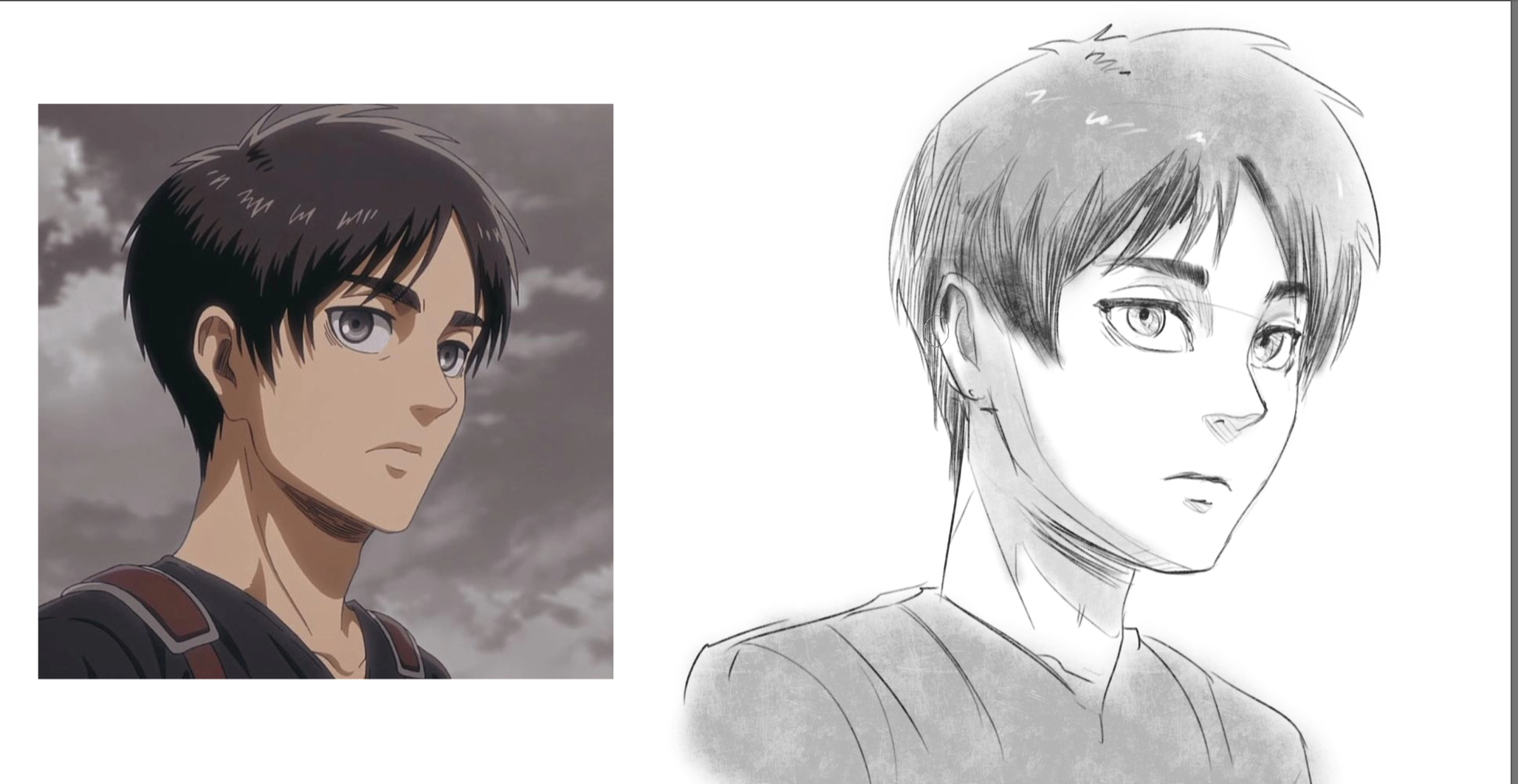 With Eren Yeager we can see that there’s a lot more detail, and the proportions are closer to realism as I said before. There are more folds in the clothes, more details and shapes to draw everywhere from the facial features to the limbs.